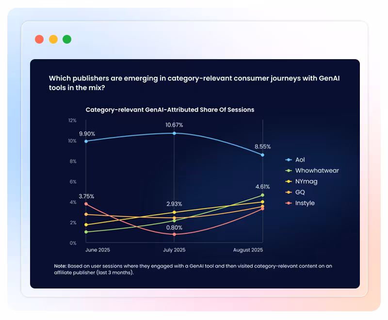 AI favors publishers with authoritative, tested recommendations. Editorial leaders such as GQ, Travel + Leisure, and Men’s Health surfaced frequently in apparel-related AI summaries. This is a signal that quality content is now both a discovery engine and a conversion driver.