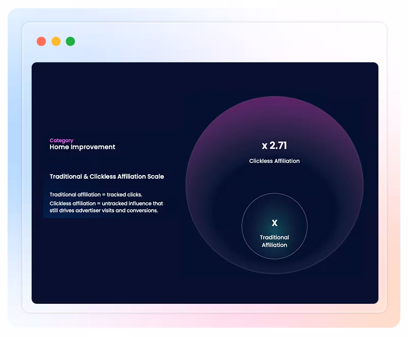Clickless Affiliation™ occurs when publisher content influences a purchase without generating a trackable click, typically through AI summaries that cite publisher recommendations.This means that for every conversion tracked through traditional affiliate clicks, home improvement publishers are driving 2.71 more conversions through invisible influence through new AI-generated summaries and LLM answers.