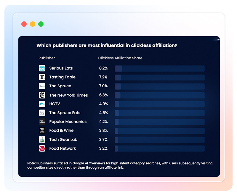 This data comes from the 2025 Clickless Affiliation™ Index Report, which analyzed hundreds of thousands of consumer journeys across 187 brands and six major retail categories. Using VantagePoint™ technology, we measured how publisher content surfaced in AI-generated search results drives measurable conversions without traditional click-through attribution.