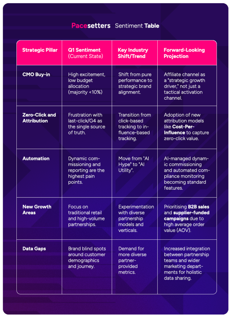The inaugural meeting of Pacesetters took place on February 26, 2026. It established a clear consensus on the channel’s evolution; affiliate is moving from a last-click performance model to a strategic, full-funnel influence driver. Key findings across three core pillars highlight a positive shift in industry perception and a significant focus on future-proofing the channel through technology and collaboration:
