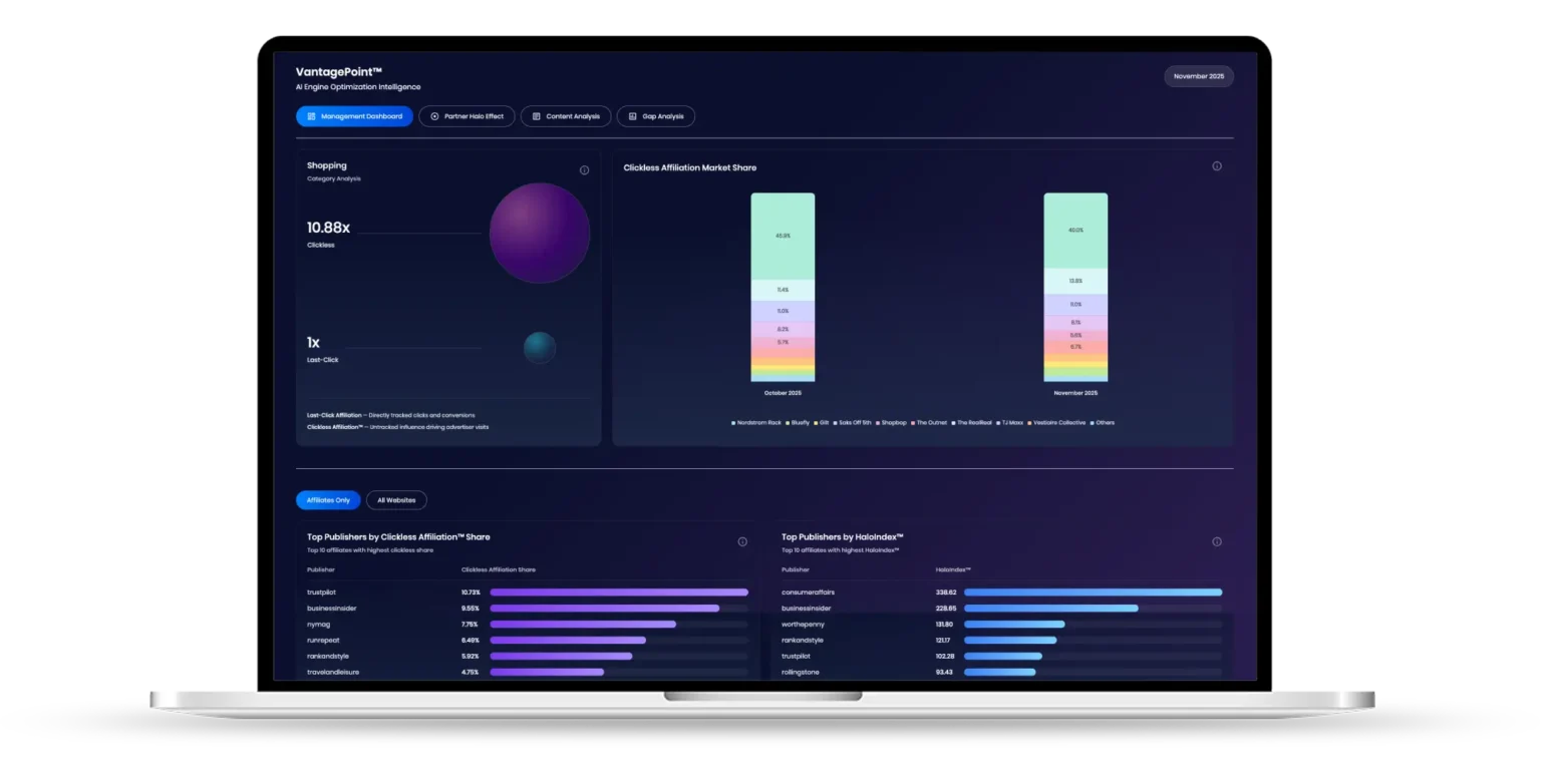 VantagePoint™ isn’t just a platform; it’s a movement to redefine and reveal value in AI-driven commerce. Access industry-leading research, benchmarks, and insights on Clickless Affiliation™ and the Zero-Click Economy.